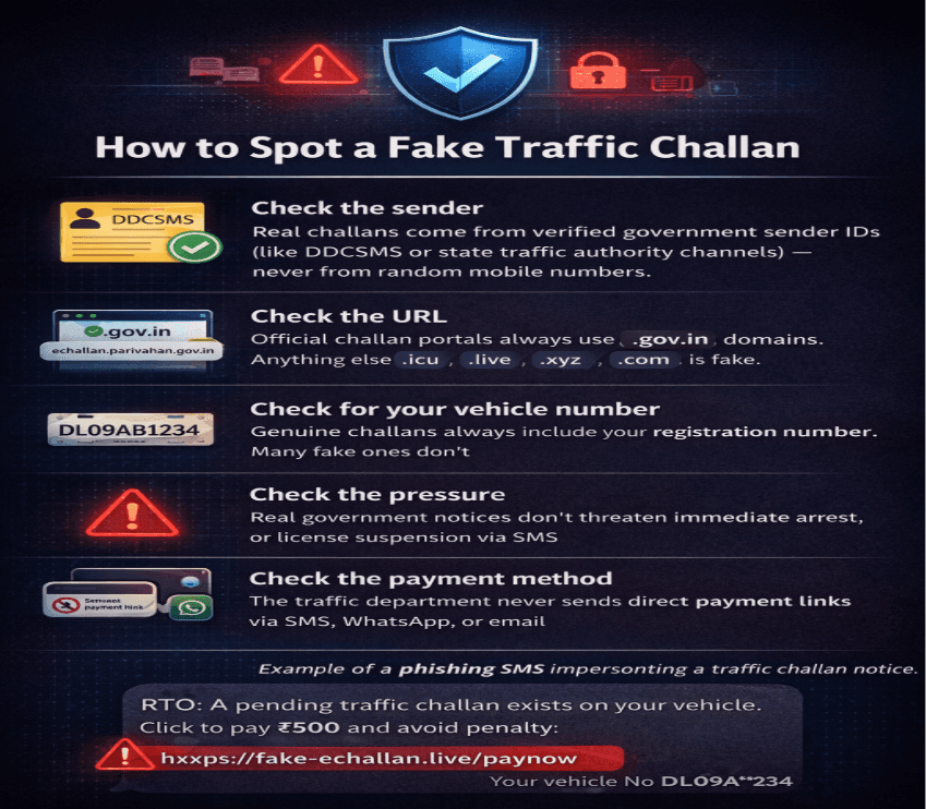 Check the sender: Real challans come from verified government sender IDs (like DDCSMS or state traffic authority channels) never from random mobile numbers